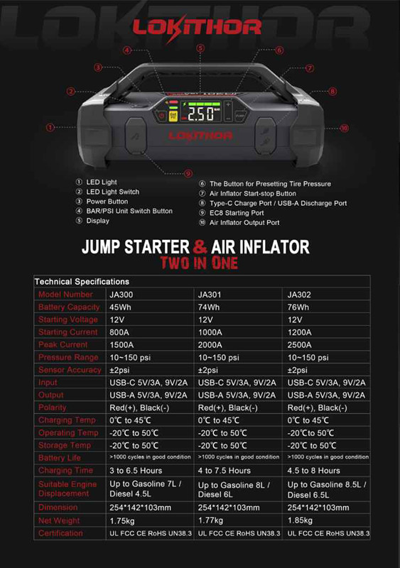 以上三種點火器都是JA產(chǎn)品,“JA”中的“J”代表跳躍啟動器,而“A”代表充氣器。這三個產(chǎn)品可以滿足不同的規(guī)格要求,參數(shù)可以參考下面的圖片(當(dāng)然,來到現(xiàn)場近距離了解,會有更好更多的美好體驗)。